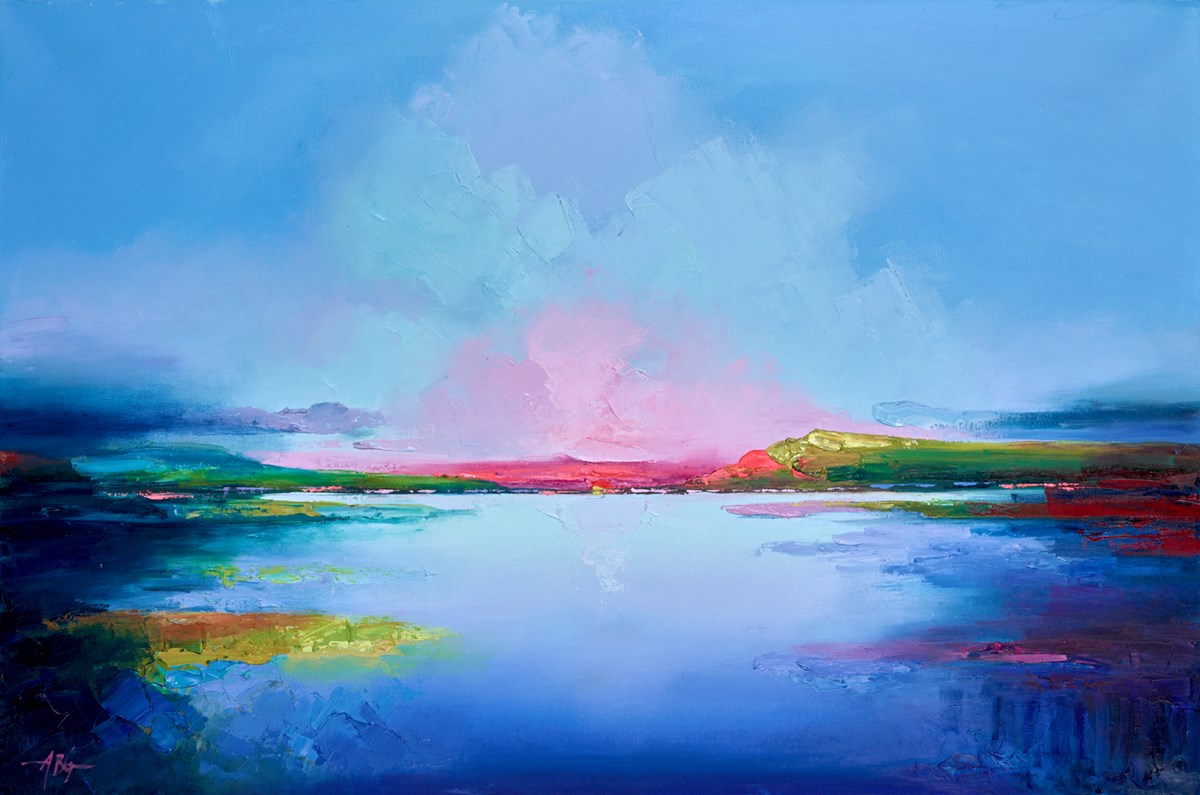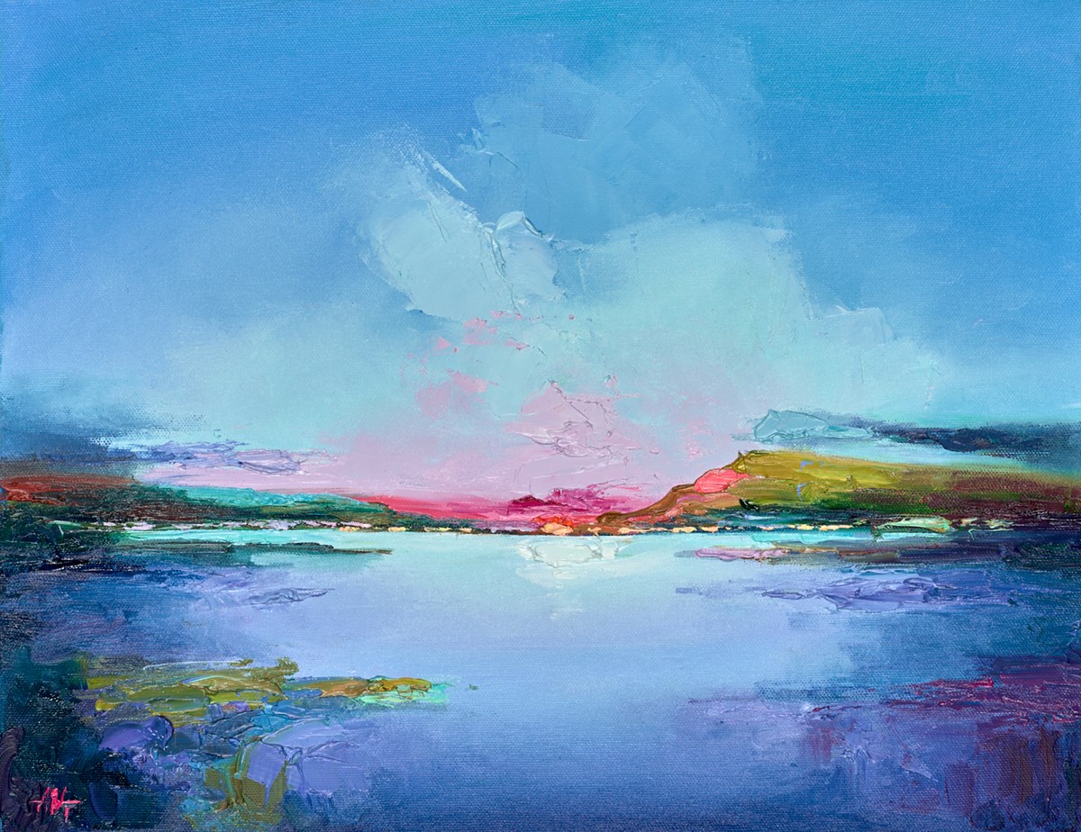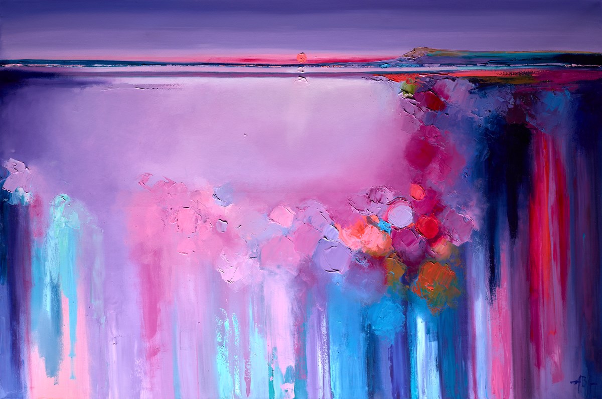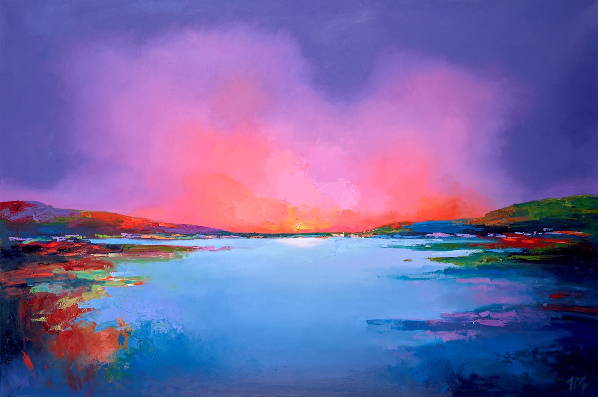 Anna’s creative reconstructions of the landscape capture the beauty and dynamism of stunning harbour locations bathed by vivid sunsets. It is the grouping of colours in a scene that initially attracts her and this visual harmony compels her to create her own image in response. Each vibrant piece portrays the energy and emotion of the environment with what the artist describes as “exploding skies” which release a whole spectrum of radiant and dramatic colours.