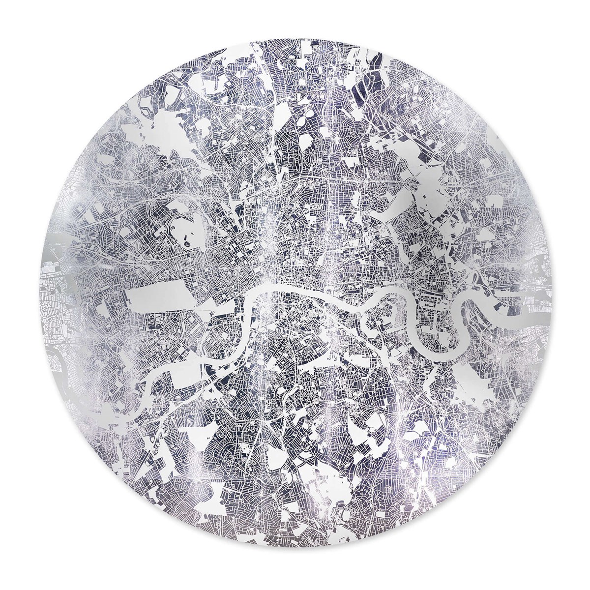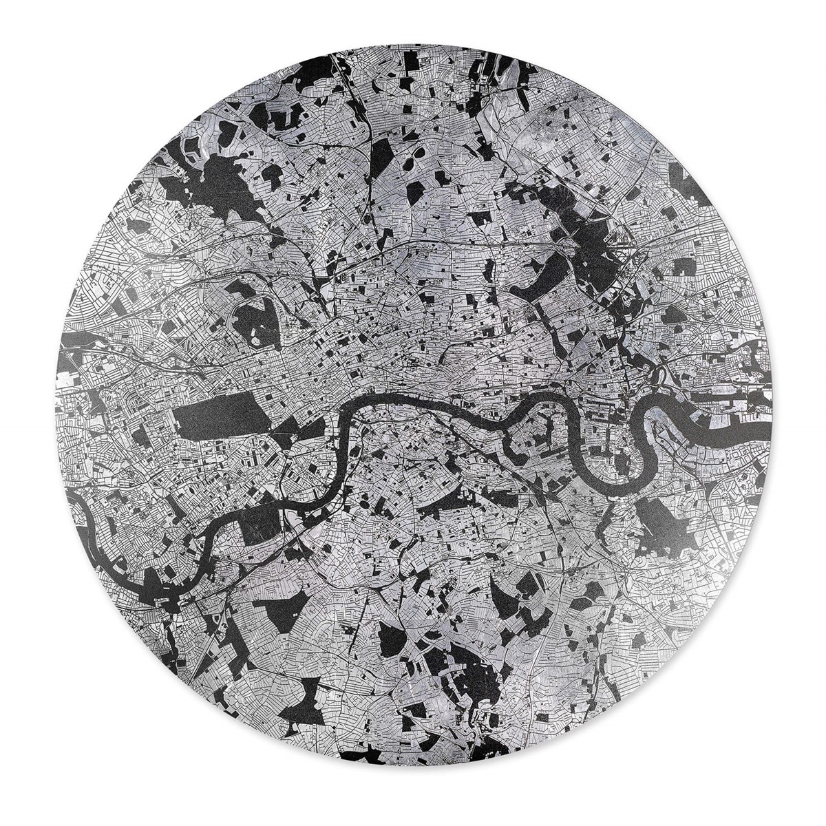 Every artwork in this series is unique and handmade. Eason uses a range of metal leaf in copper, silver and gold tones to lay down an opulent reflective surface; onto this, rivers, roads, paths and parks are printed in either black or white. The metals Eason chooses to work with represent the high and equal value of the people living in the chosen cities, a deliberate statement rejecting the use of colours in influential 19th century maps to define social class. His dedication to accuracy and complex detail means that as well as being recognised as artworks, his Mappa Mundi have won numerous awards from the Cartographic Society and the Ordnance Survey.