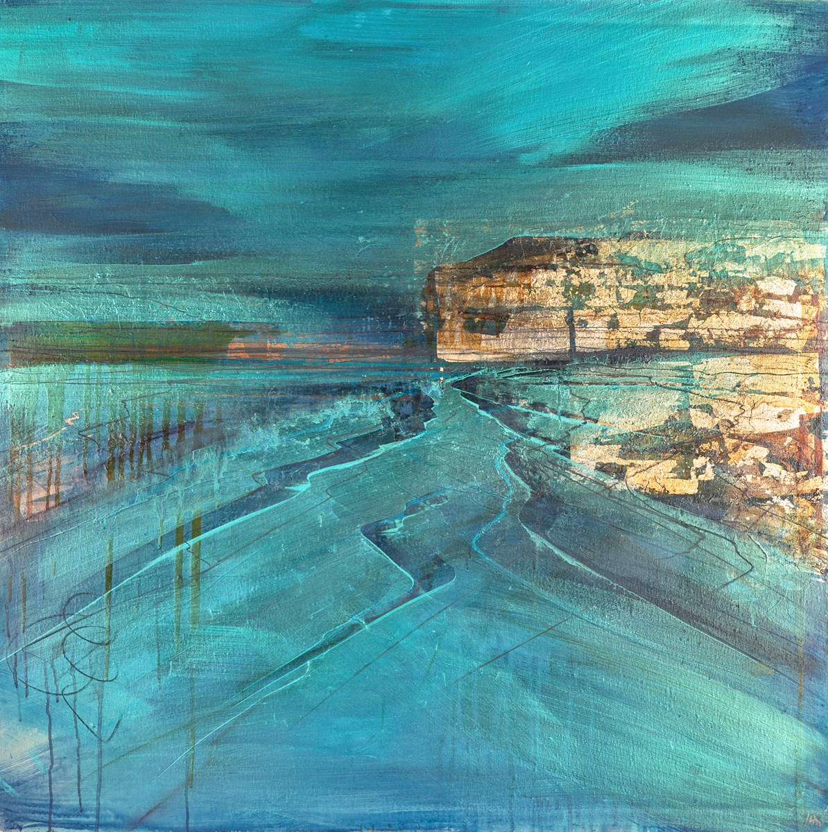 Working primarily in acrylic, with layers of pastel, charcoal, and gold leaf, Watkins paints with instinct and speed. He often works on location, gathering sand or soil to grind into the surface of some of his canvases, making these paintings a literal extension of the land itself. The result is a raw and tactile aesthetic that echoes the rugged beauty of cliffs, coastlines, and valleys while also offering profound emotional resonance.