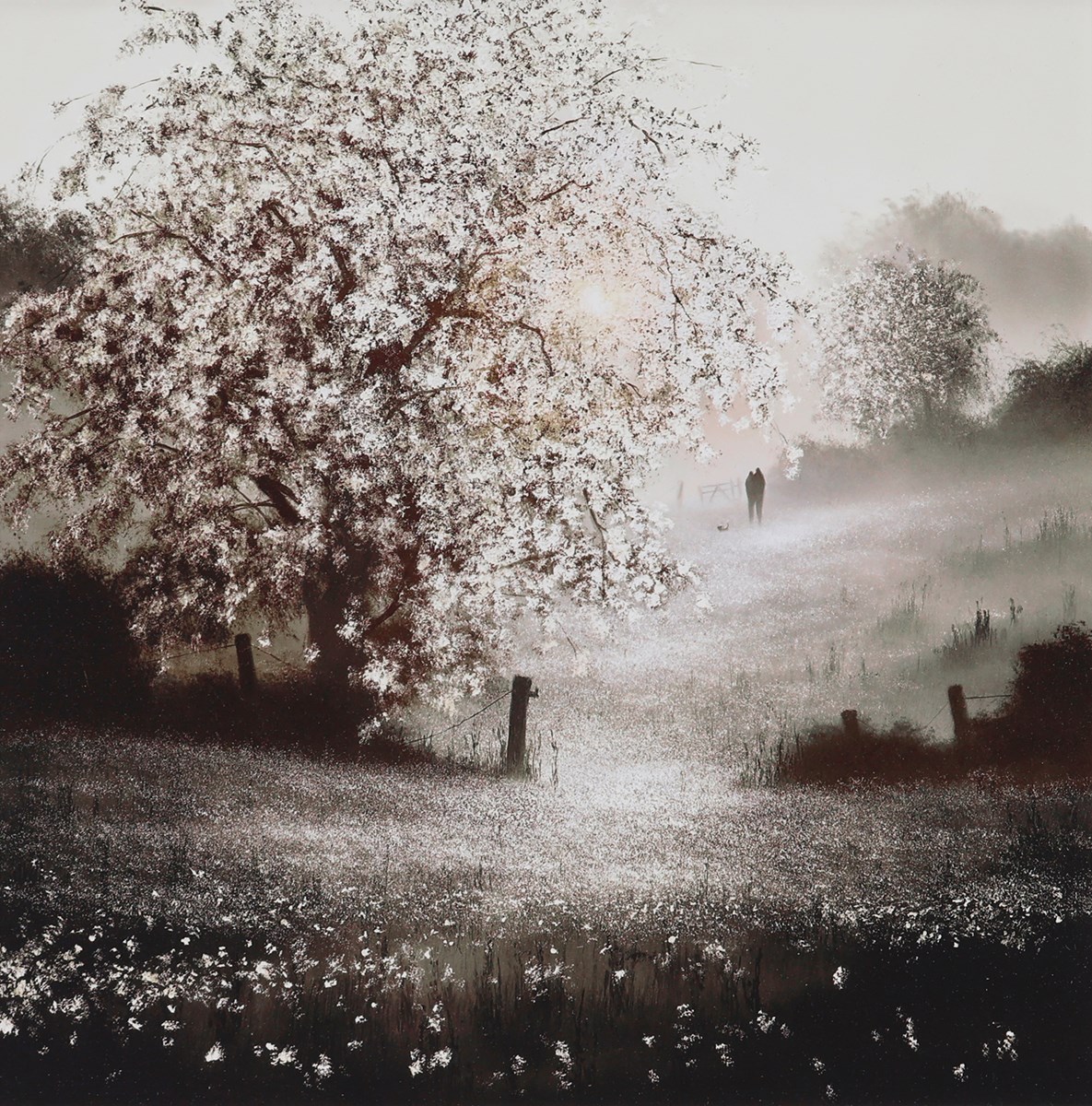 John creates idealised images which have inspired a generation of art lovers. His creative process is painstaking and meticulous, involving weeks of preparation prior to working on the finished oil painting. Each piece originates in a memory or an emotion, which he may jot down as a title, a quick sketch, or something more in-depth - sketches or drawings which help him to reconnect with the feelings or memories that gave him that initial idea. He describes himself as a student of light, explaining that he studies the light as much as, if not more than, the physical aspects of a landscape; how the light may fall on some grasses or reflect on the water of a flooded field.