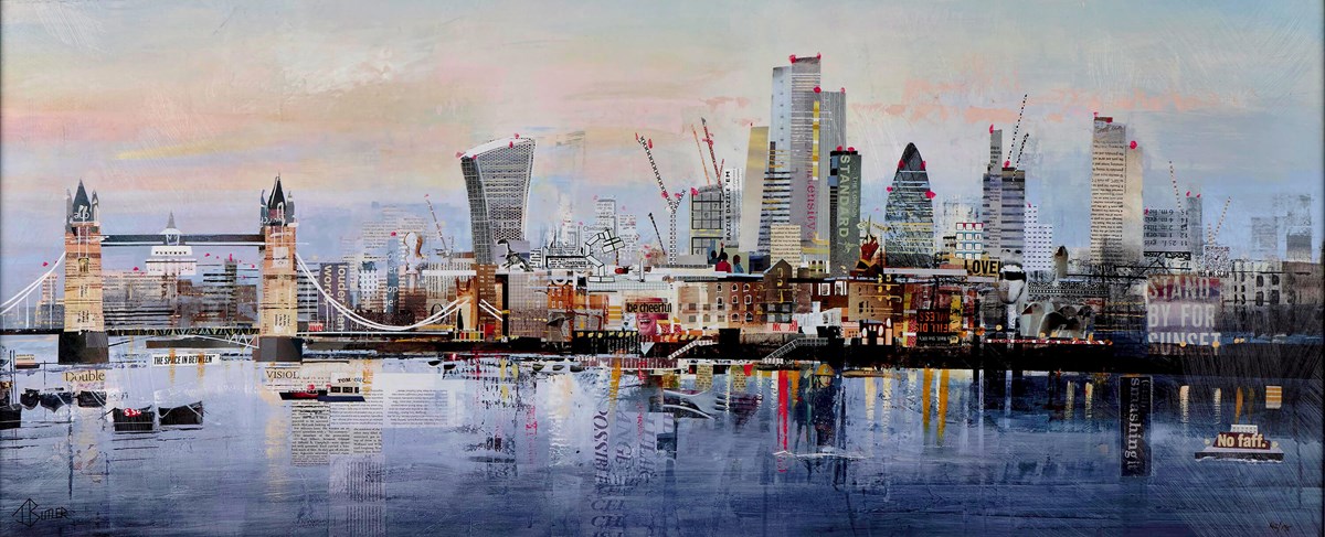 Tom Butler creates his showstopping collages using a whole range of materials; in his imaginative hands a section of a crossword puzzle may become a block of flats, a wine bottle, or a church spire, and this unique approach adds intrigue, resonance and a touch of humour to every scene.